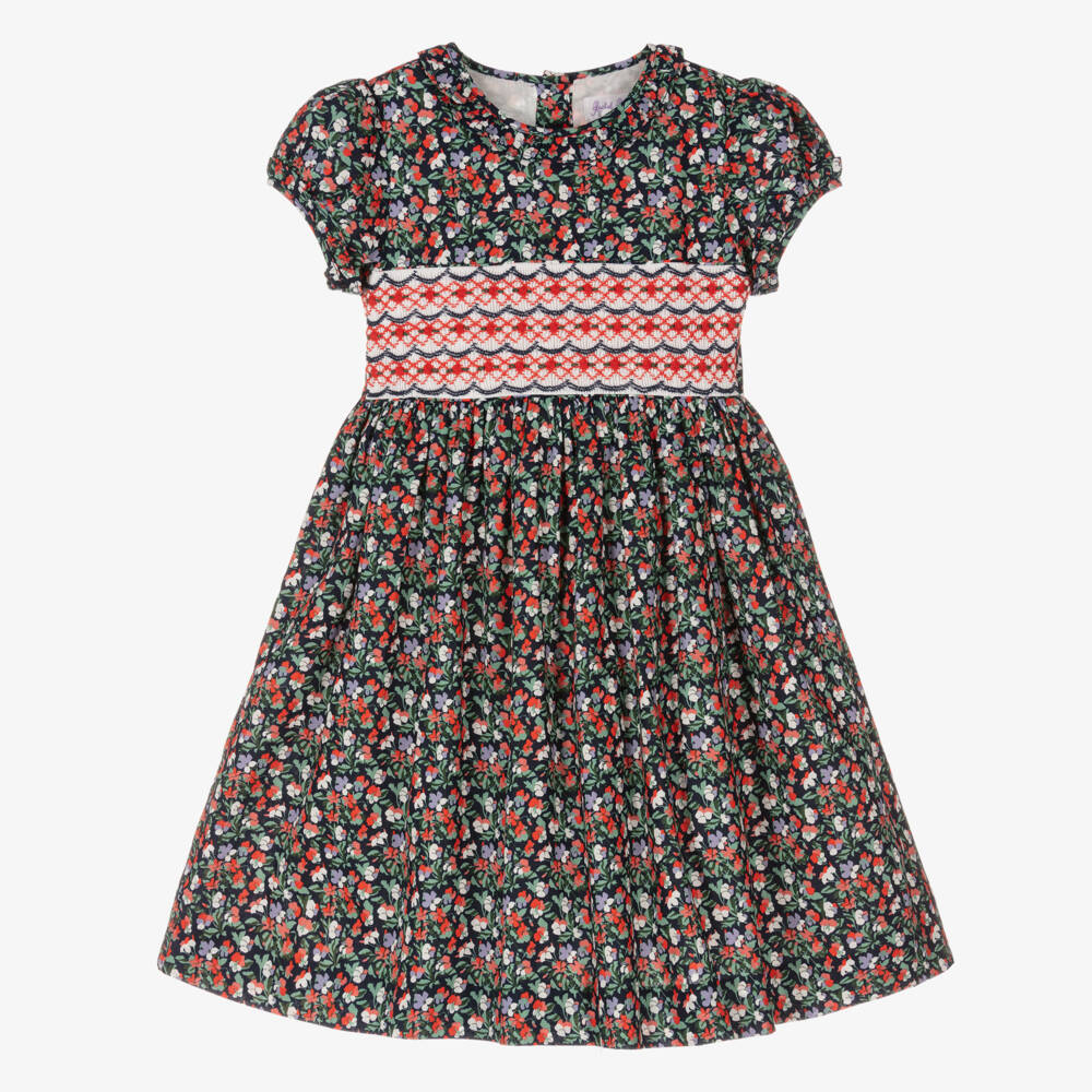 Navy blue dress for girls by British brand Rachel Riley, made in soft, lightweight cotton. It has a blue, red and green floral pattern with sweet ruffle trims on the collar and puffed sleeves. Traditionally-styled, this pretty, feminine dress has a classic, hand-smocked panel on the bodice, with red and blue floral hand-embroidery for a timeless finish. Fully lined for comfort, it fastens with buttons on the back.