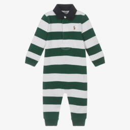 Cute, bright blue romper for baby boys by Ralph Lauren, made in mid-weight cotton-blend jersey with a cosy fleece feel inside. Practical poppers fasten on the back and between the legs, and the American brand's beloved Polo Bear and logo print can be seen on the front.