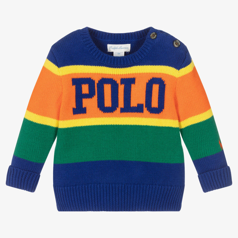 Blue, orange and green striped sweater for baby boys by Ralph Lauren, in a soft, mid-weight cotton knit. Instantly recognisable, this statement sweater has an intarsia-knit logo on the front and the signature pony logo embroidered in orange on one sleeve. It has cosy ribbed trims, turn-up cuffs, and branded button fastenings on one shoulder.