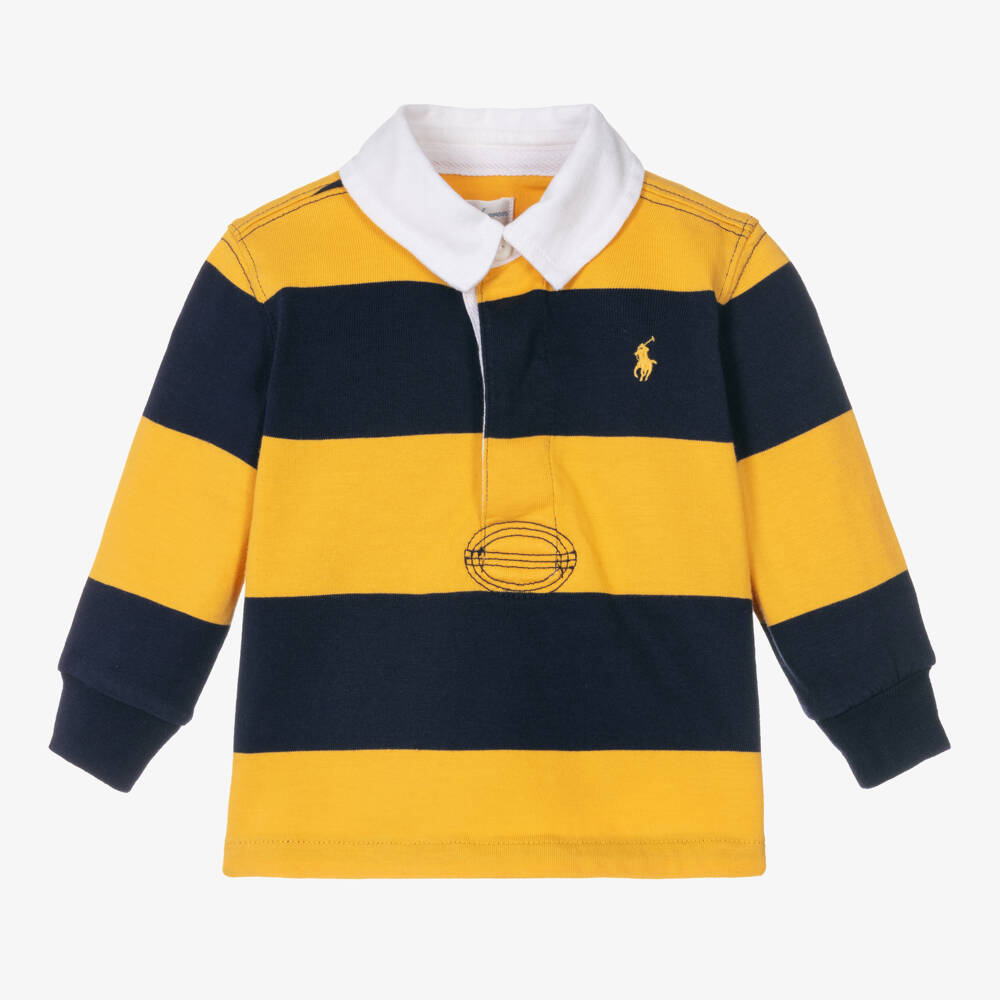 Navy blue and mustard yellow polo top for baby boys from Ralph Lauren, with rugby shirt styling. It is made in soft, stretchy cotton jersey, gentle on baby's delicate skin. Striped for that classic look, this top is embroidered with the yellow pony logo for instant brand recognition. With a white twill collar, it fastens with concealed front buttons for neatness.