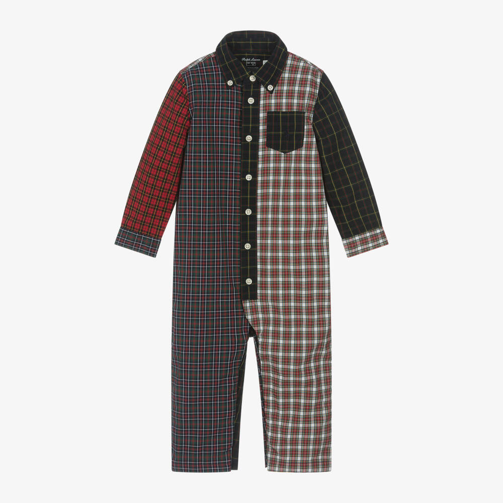 A charming babysuit for boys by Ralph Lauren, in a festive inspired shades of red and navy blue. Made in lightweight cotton poplin, it is fully lined in soft cotton jersey for comfort. This shirt style romper is designed in a combination of check patterns with the signature pony logo embroidered on the chest pocket. It buttons down on the front, collar and sleeve cuffs, with practical poppers to fasten between the legs.