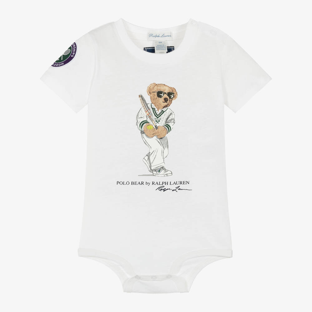 Off-white bodyvest for baby boys by Ralph Lauren, made in soft cotton jersey. Part of the brand's Wimbledon collection, it features a tennis-playing Polo Bear and signature logo on the front, with the official Championships logo patch on one sleeve. There are useful popper fastenings on one shoulder and between the legs to help with dressing. This product is made with recycled cotton.