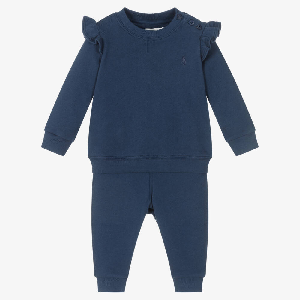 Beautiful navy blue tracksuit for baby girls by American brand Ralph Lauren, made in soft and lightweight cotton jersey with a looped underside. The sweatshirt has the signature pony logo embroidered in navy blue, ruffle trimmed sleeves, and anchor-embossed button fastenings on one shoulder. Ideal for lounging and relaxing, the joggers have a decorative bow on the waistband and cosy ribbed trims.