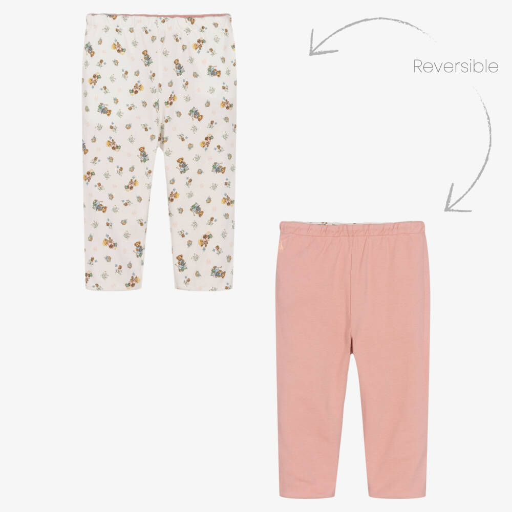 Baby girls cotton jersey trousers by Ralph Lauren. Fully reversible, one side has an ivory and teddy bear logo print and the reverse is in pink. They have an elasticated waistband for comfort and fit, with cute pockets at the sides.