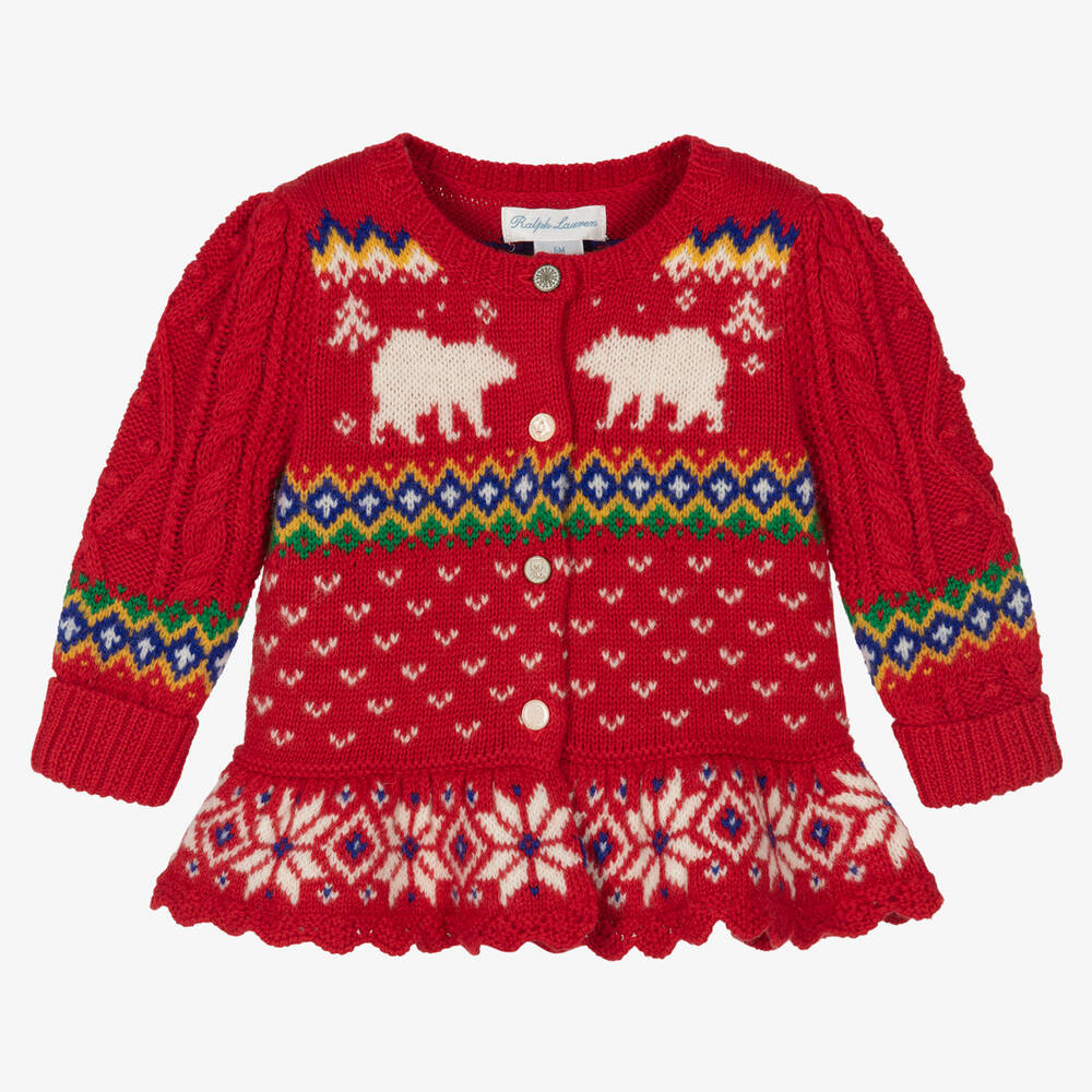 Gorgeous red festive cardigan for baby girls by American brand Ralph Lauren. Knitted in a warm wool blend, it has a colourful Fair Isle pattern with polar bears and snowflakes. Feminine touches add to its appeal, with puffed sleeves and a frilled hemline with a scalloped trim. It has fixed turn-up cuffs and cute logo button fastenings.
