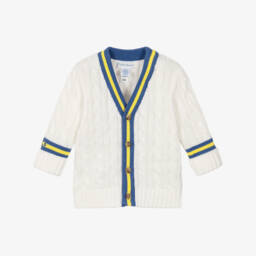 Baby girls red and ivory cardigan by Ralph Lauren, beautifully knitted in a soft cotton and wool blend. Ideal for layering, this Fair Isle design incorporates festive reindeer motifs, snowflakes and hearts. A distinctive Polo logo can also be seen on one cuff. The buttons are embossed with different patterns and the long sleeves are gently gathered on the shoulder. The pointelle-knit collar and peplum hem both have scalloped trims, adding extra charm.
