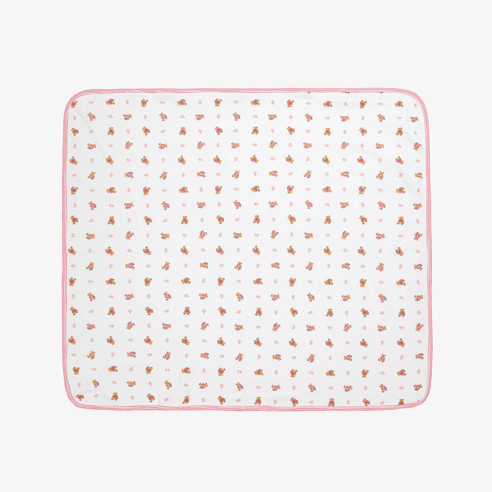 An adorable white cotton blanket for baby girls by Ralph Lauren, patterned with the brand's signature Polo Bear mascot and monogram logos in pink. Made in a double layer of super soft jersey, it has striped trim and a plain reverse side. This versatile accessory can be used in the nursey, for wrapping baby, or when out and about in the stroller or car seat.