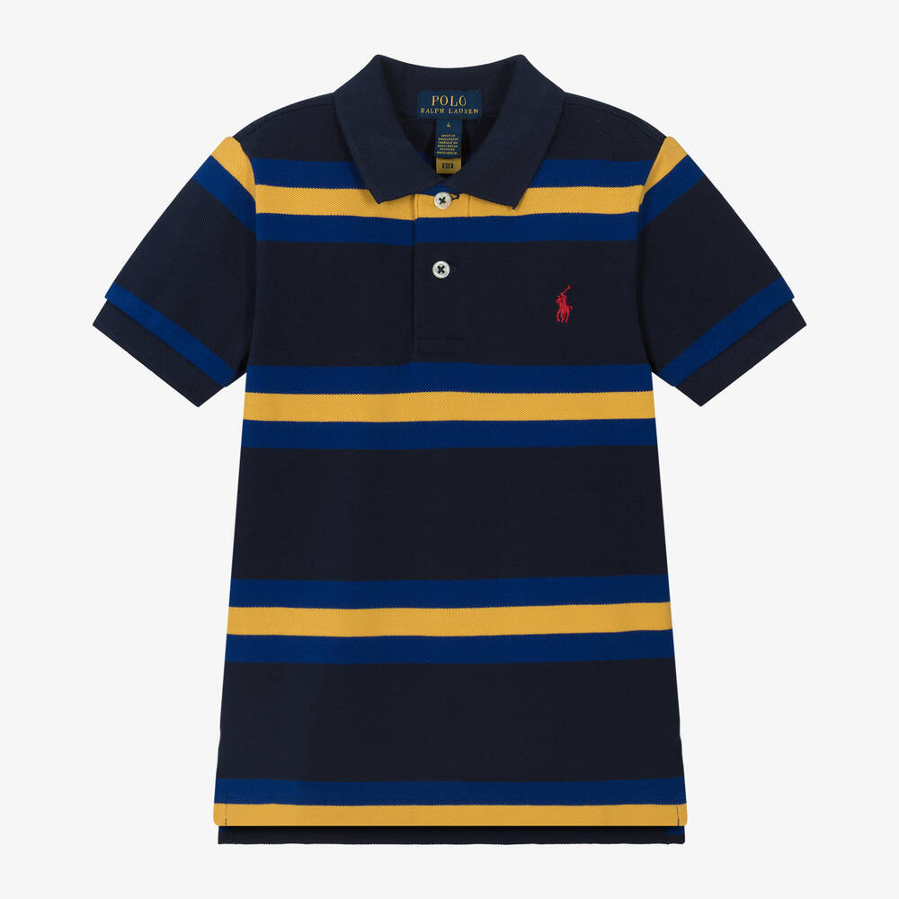 Designed with blue and yellow stripes, this polo shirt for boys by Ralph Lauren is made in soft cotton piqué. It is classically styled with button fastenings and a sporty split hem, with red pony logo embroidery adding designer appeal.