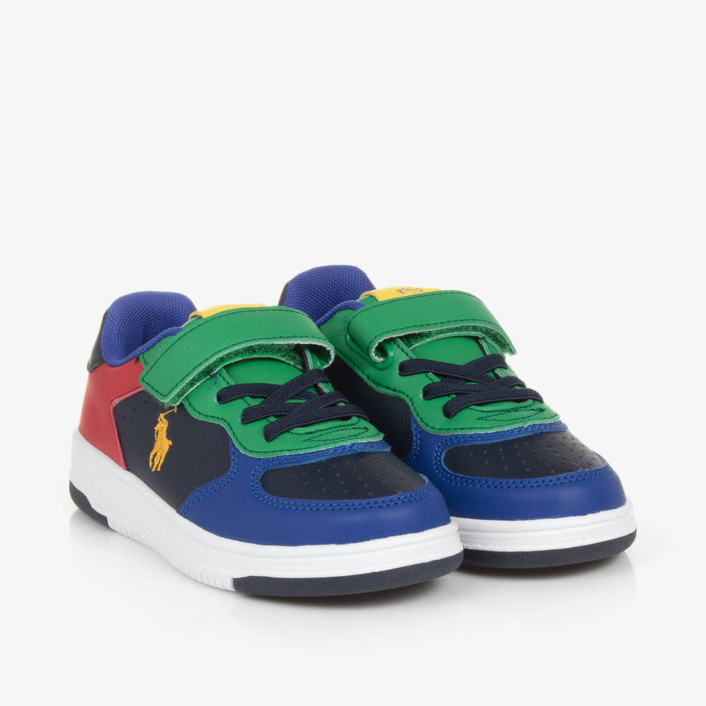Colourblock faux leather trainers for boys by Ralph Lauren, in bright blue, green and red shades. They are lined in soft mesh, with a padded insole for comfort. They have elasticated laces and a velcro fastening strap across the foot. For instant brand recognition, the signature pony logo is embroidered on one side in yellow, with further logo detailing on the tongue and heel. These fun, colourful trainers have non-slip rubber outer soles for good grip.