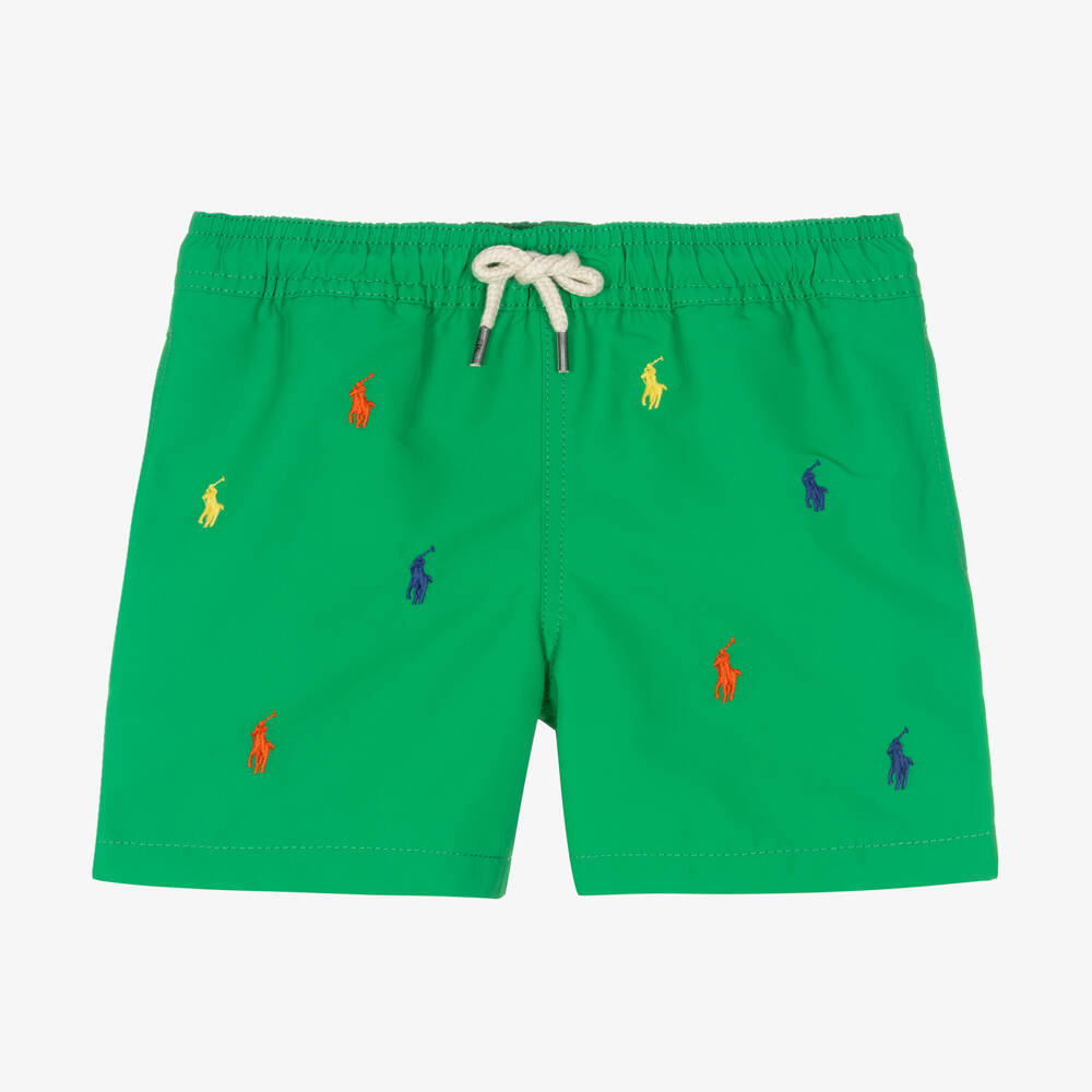Green swim shorts for boys by Ralph Lauren, made in smooth recycled fabric. They are patterned with the brand's signature pony logos embroidered in orange, blue and yellow. They have side seam pockets and a button fastening pocket on the back. Fun and colourful, they have a mesh lining for comfort and an elasticated waistband with a useful drawstring fastening.