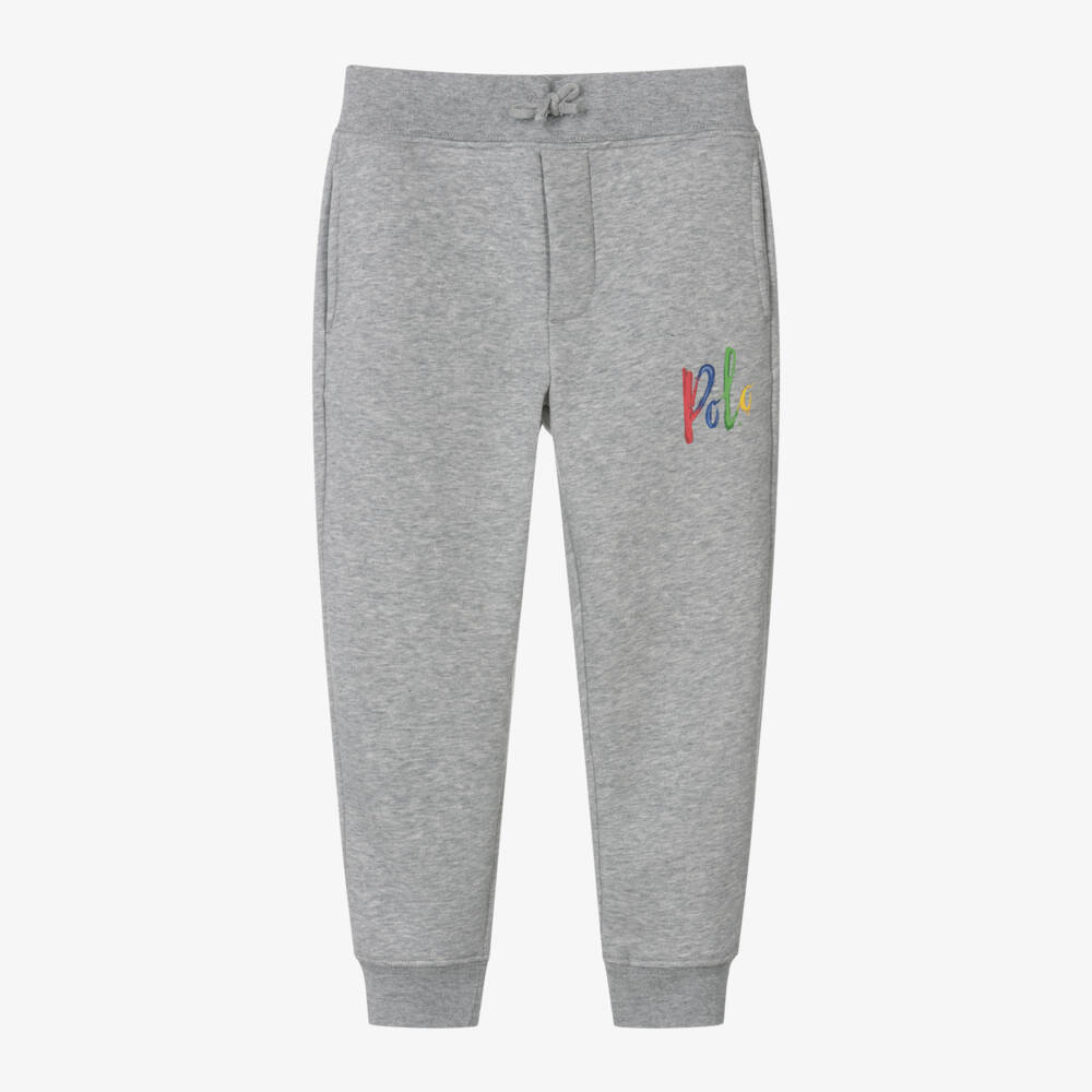 Casual and comfortable for boys, these grey marl cotton-blend joggers are by Ralph Lauren. Made in soft jersey with a cosy fleecy inside, they have an elasticated drawstring waist and side seam pockets. A multicolour paint-effect Polo logo is printed on one side.