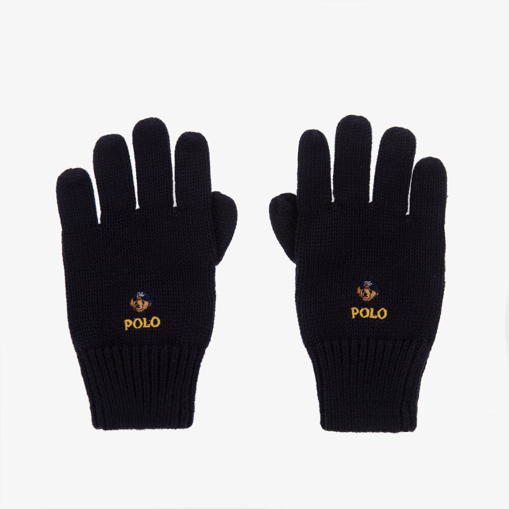 Navy blue gloves for boys by Ralph Lauren, made in a soft cotton knit. For designer appeal, each glove features yellow logo embroidery and the brand's recognisable Polo Bear.