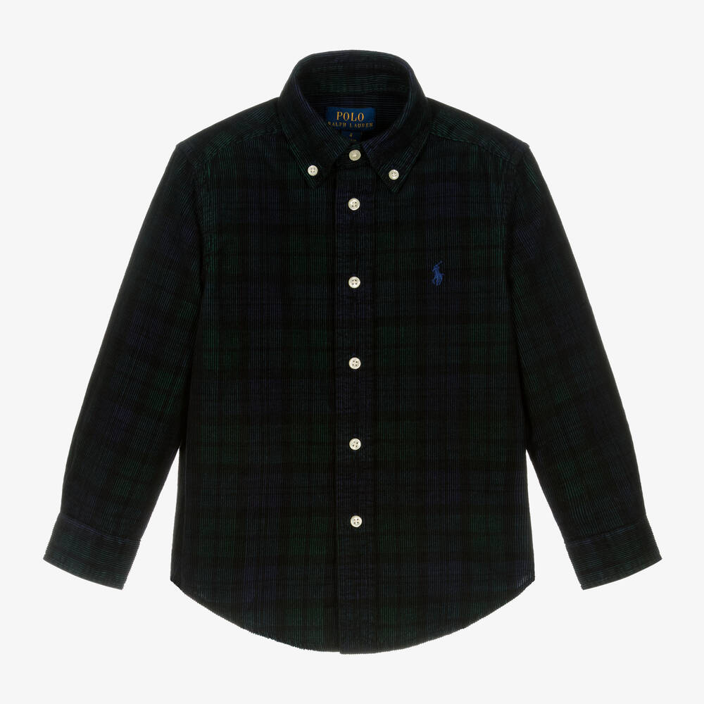 Синяя хлопковая вельветовая рубашка для мальчиков от Ralph Lauren с деликатным зеленым клетчатым узором. Классический стиль с воротником на пуговицах и перламутровыми застежками. Для дизайнерского акцента фирменный логотип пони вышит на груди синим цветом.
