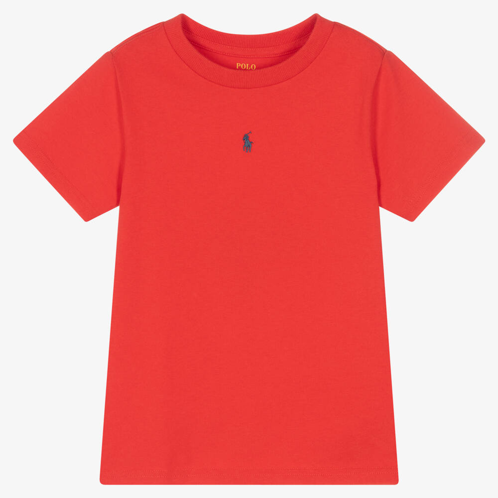 Red cotton T-shirt for boys by Ralph Lauren, made in comfortable, stretchy jersey for relaxed days. The brand's signature pony logo is embroidered on the front in navy blue.