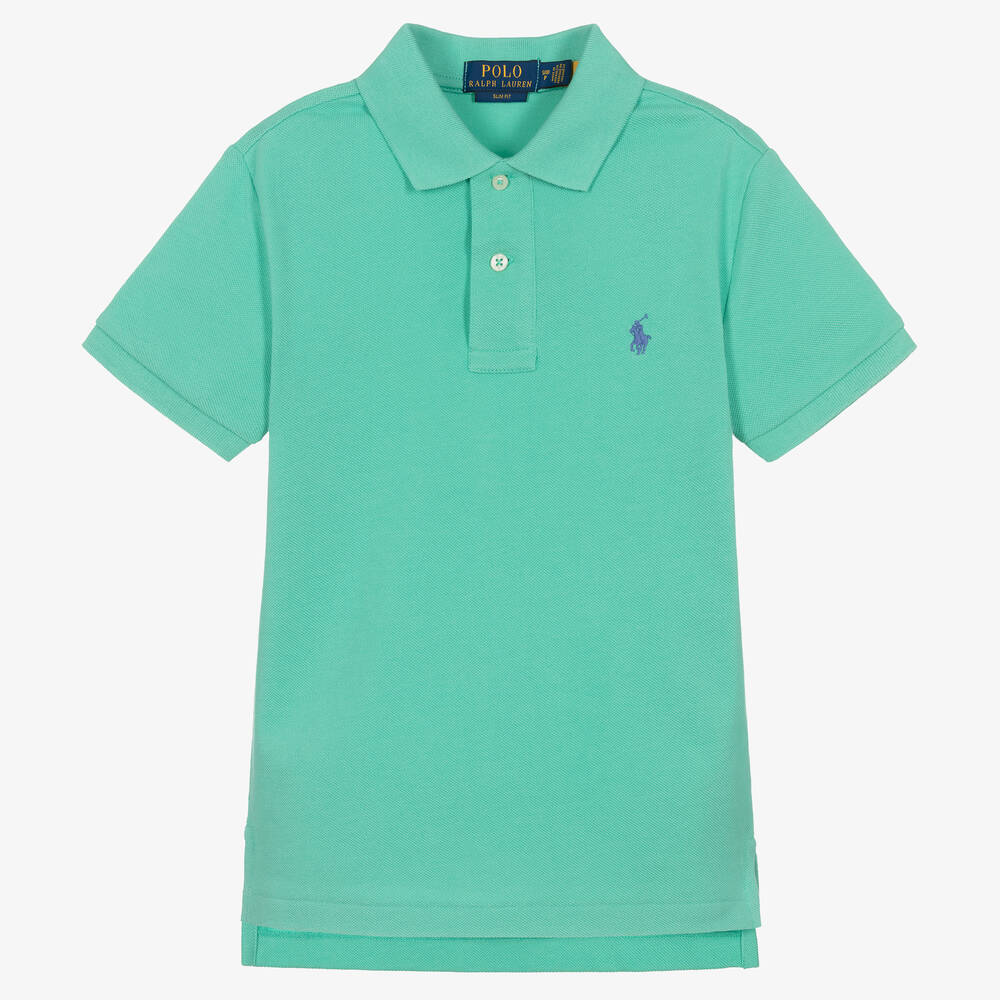 Turquoise green polo shirt for older boys by Ralph Lauren, made from soft and stretchy cotton piqué. With a textured look, this signature style has front button fastenings and lightly ribbed trims. Cut for a slim fit, the side vents on the hem create a sporty, laidback look. The brand's pony logo is embroidered on the chest in blue for instant brand recognition.