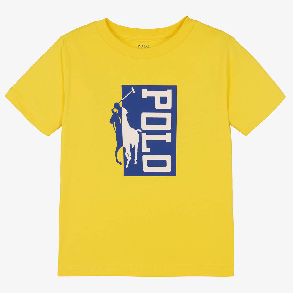 Bright yellow cotton T-shirt for boys by Ralph Lauren, made in comfortable jersey for relaxed days. With an oversized fit, it has a large blue and white Big Pony logo printed on the front that changes colour in the sun to blue and orange.