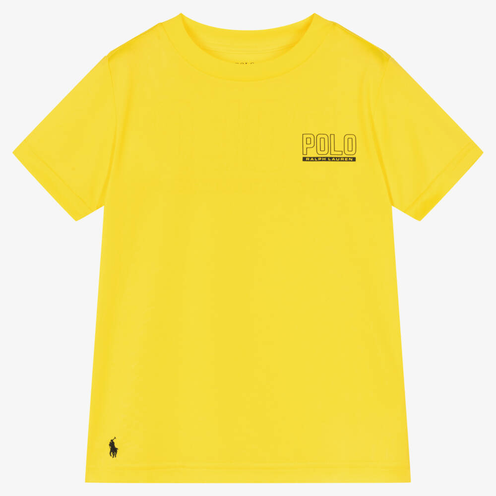 Bright yellow T-shirt for boys by Ralph Lauren, made in lightweight recycled technical jersey. The fabric is designed with moisture wicking properties to keep the wearer cool, dry and comfortable. This sporty T-shirt has black logo prints on the front and back and the brand's signature pony logo embroidered by the hem in black.