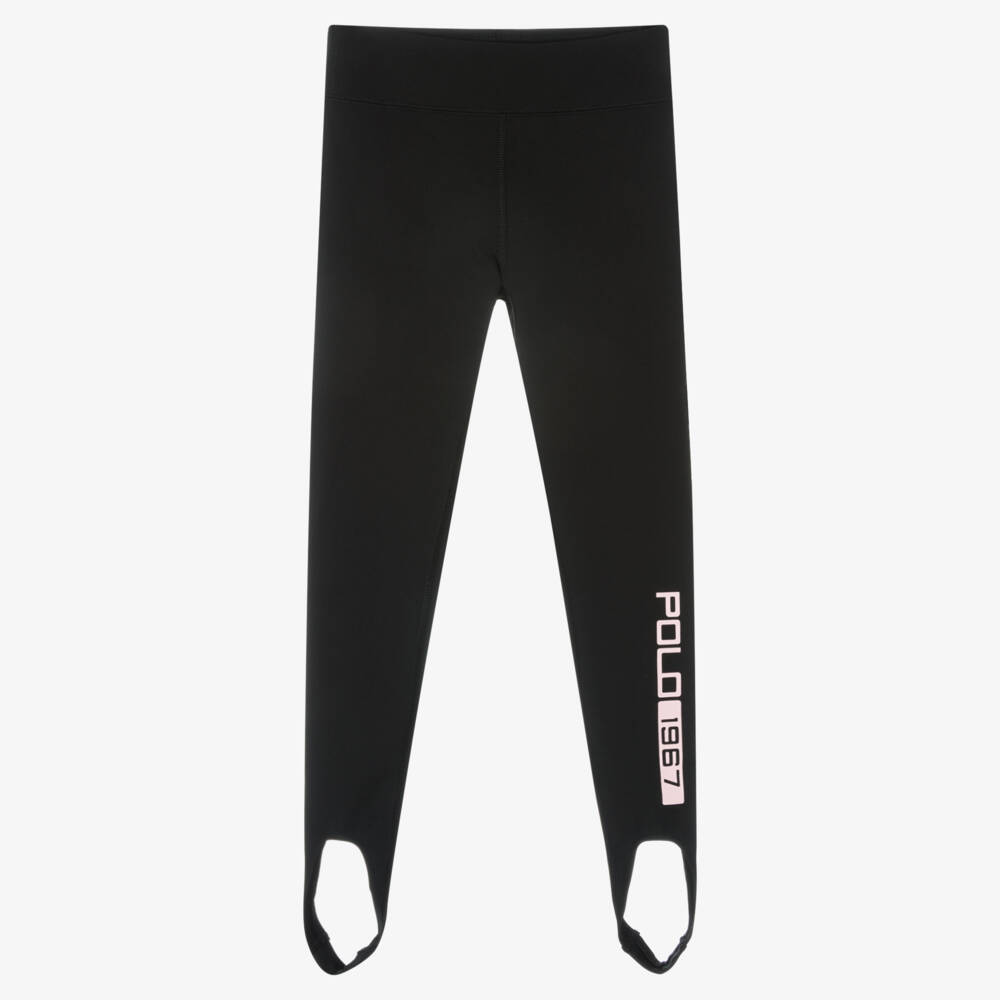 A black pair of sports leggings for girls by American brand Polo Ralph Lauren, printed with a pink brand logo on one leg. Ideal for exercise or lounging, these leggings are smooth and stretchy, with stirrups at the hem for supportive, comfortable fit.