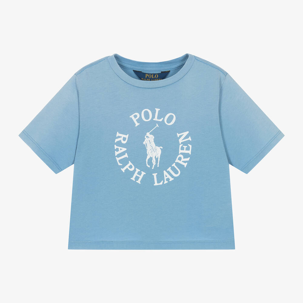 A faded blue short-sleeved T-shirt for girls by Ralph Lauren, made from soft cotton jersey. The brand's signature pony logo is surrounded by a white circular print for a sporty, casual look. This boxy tee has a crew neck with tonal topstitching on the back.
