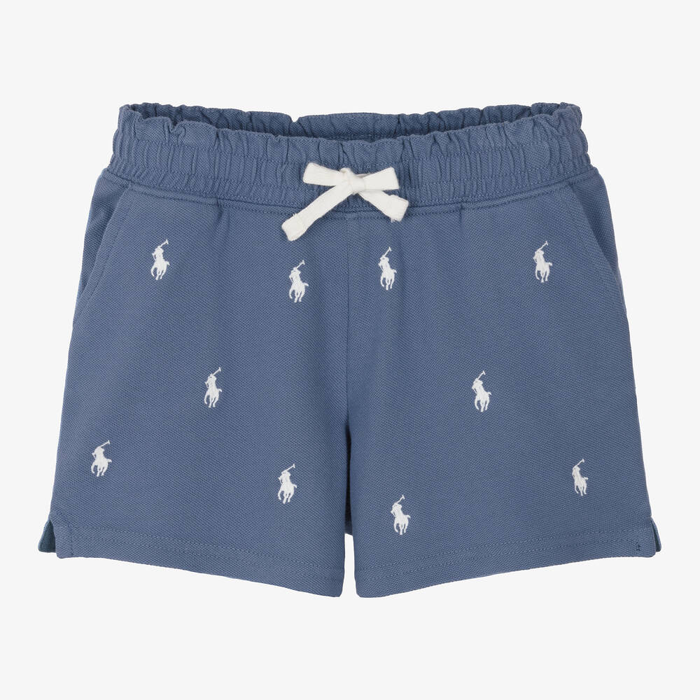Blue shorts for girls by Ralph Lauren, made in soft cotton piqué. Embroidered with the iconic pony logo across the front for a signature look, this two-tone style has a drawstring waistband for comfort.