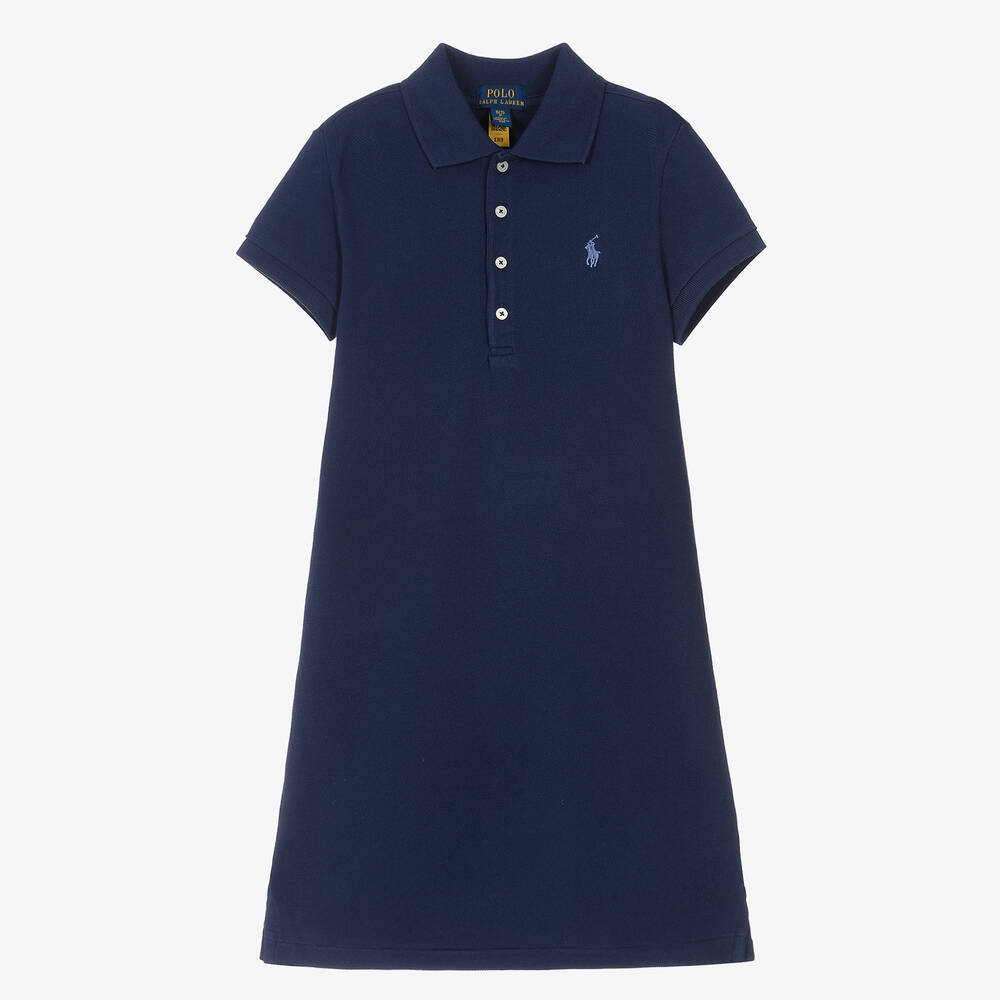 Navy blue cotton polo shirt style dress for girls by American designer Ralph Lauren. Made in soft, comfortable piqué, it has the brand's signature pony logo embroidered on the front in contrasting blue. The dress has ribbed trims and logo button fastenings on the front, with side vents on the hemline.