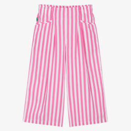 Navy blue and white striped trousers for girls by Ralph Lauren, woven in smooth cotton poplin. This stylish wide-leg design has concealed side seam pockets and a comfortable elasticated waist with a faux drawstring detail.