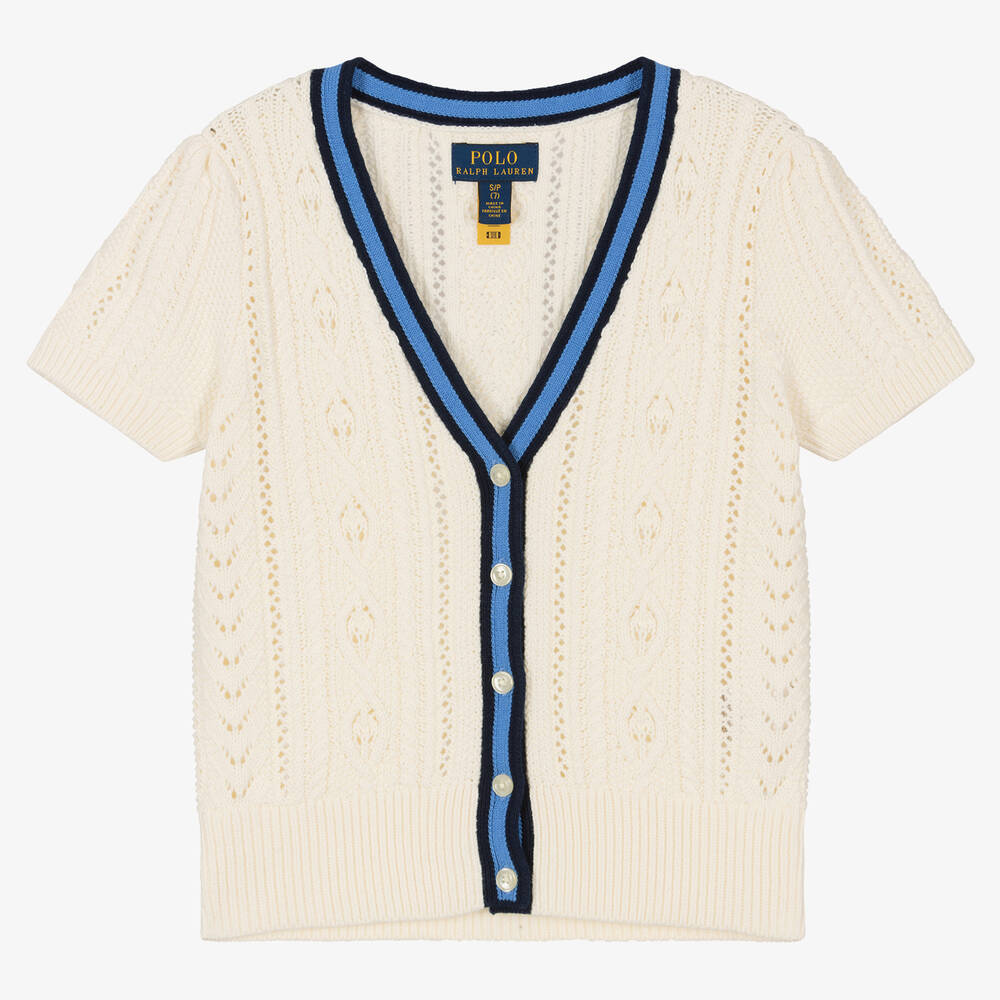 Beautiful ivory V-neck cardigan for girls by Polo Ralph Lauren. Made in soft, breathable cotton for comfortable wear, it has pretty cable and lace knit patterns and blue striped trim for a classic preppy look. Branded button fastenings give a discreet designer finish to this lovely short-sleeved style.