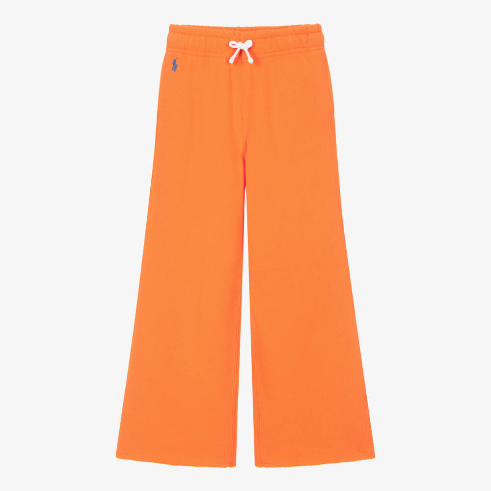 Orange joggers for girls by Ralph Lauren, in a modern wide-leg style with raw edge hems. Casual and comfy, they are made in soft sweatshirt jersey with a warm fleecy inside. There are useful side seam pockets, and the elasticated waist has drawstring ties for an adjustable fit. The brand's small pony logo is embroidered at the hip for a signature look.