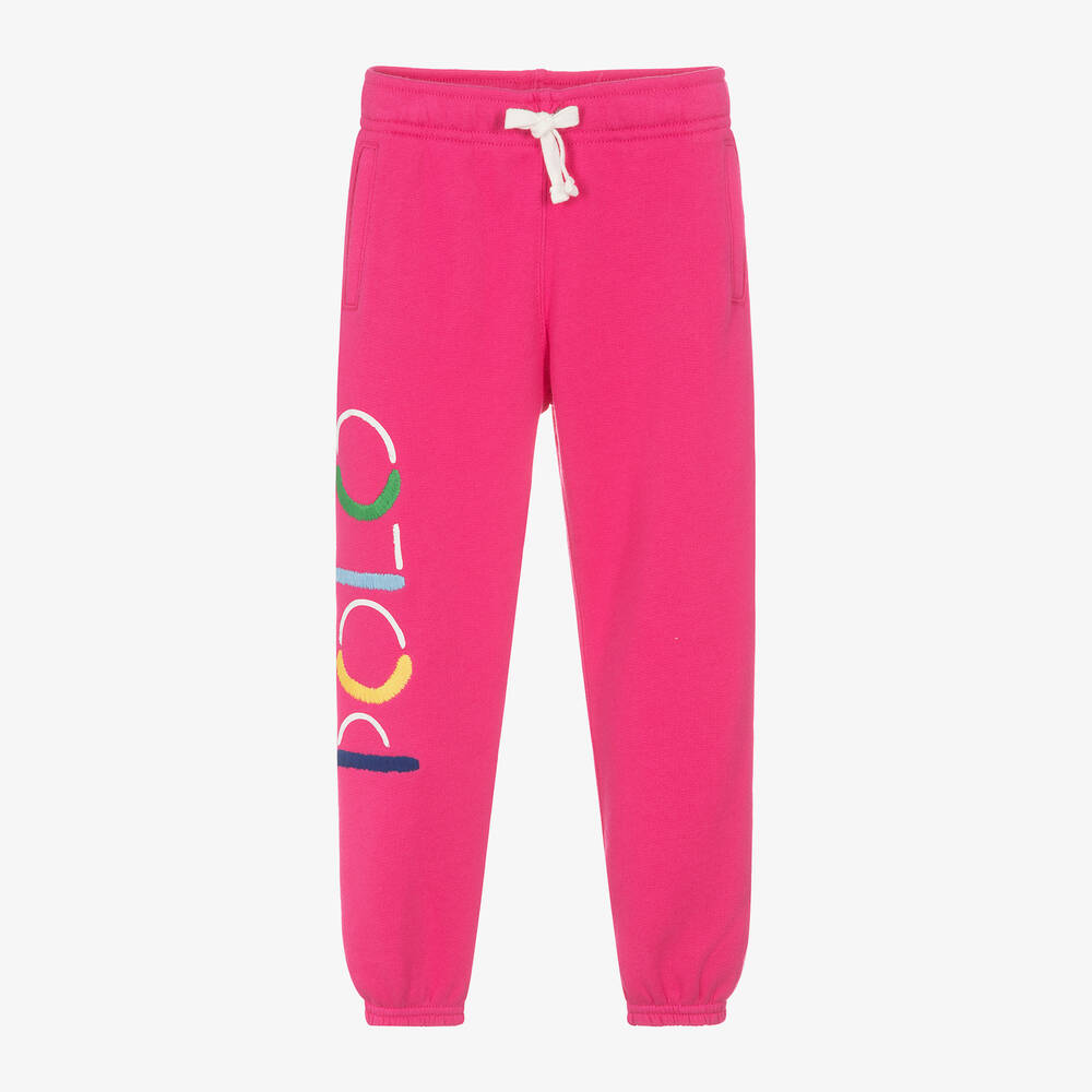 Fuchsia pink joggers for girls by Ralph Lauren, made in a super soft, mid-weight cotton-blend jersey. Easy to pull on, this casual cuffed style has an elasticated waistband with an adjustable drawstring tie and practical front pockets. For a distinctive designer look, they have a bold logo design on one leg in colourful embroidery and white print.