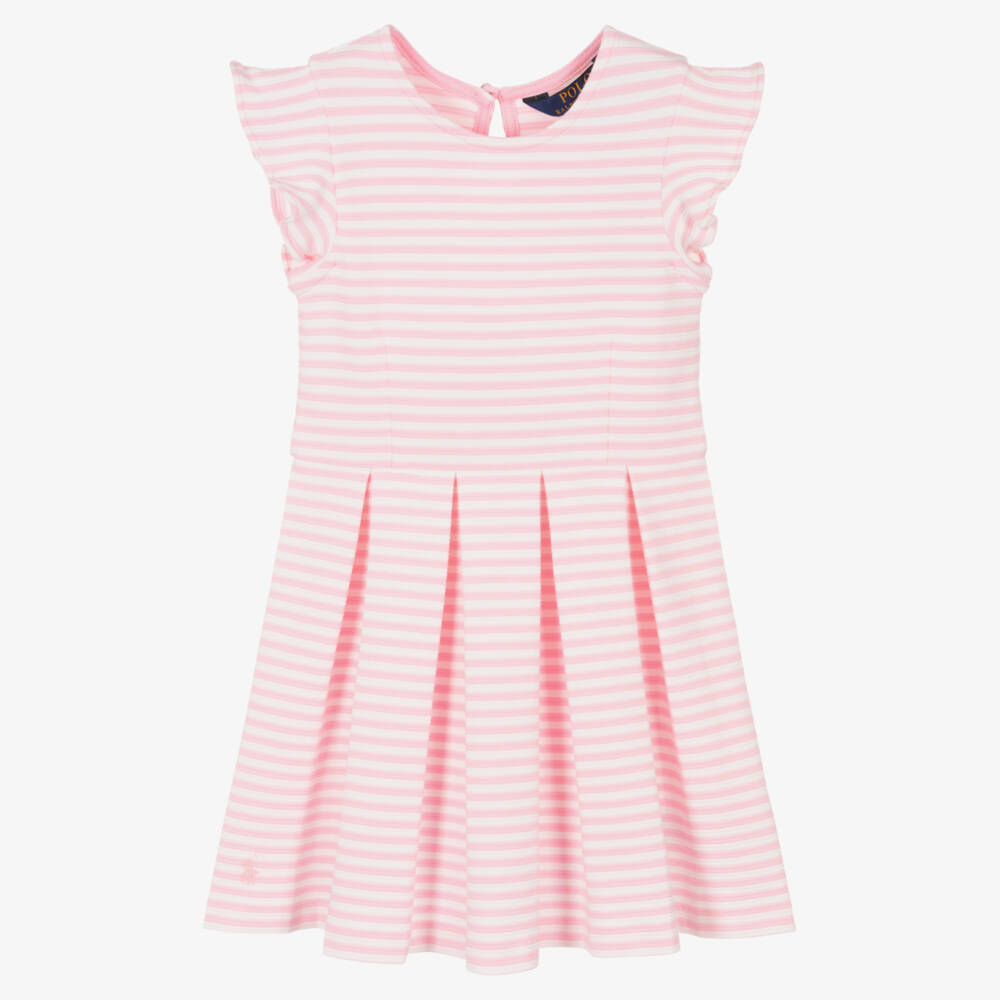 Beautifully combining comfort and style for girls, this pink and white striped dress from Polo Ralph Lauren is made in soft ribbed cotton jersey. Simply styled with a round neckline and flutter sleeves, it has a box pleat skirt for a smart look and an elegant keyhole button fastening on the back.