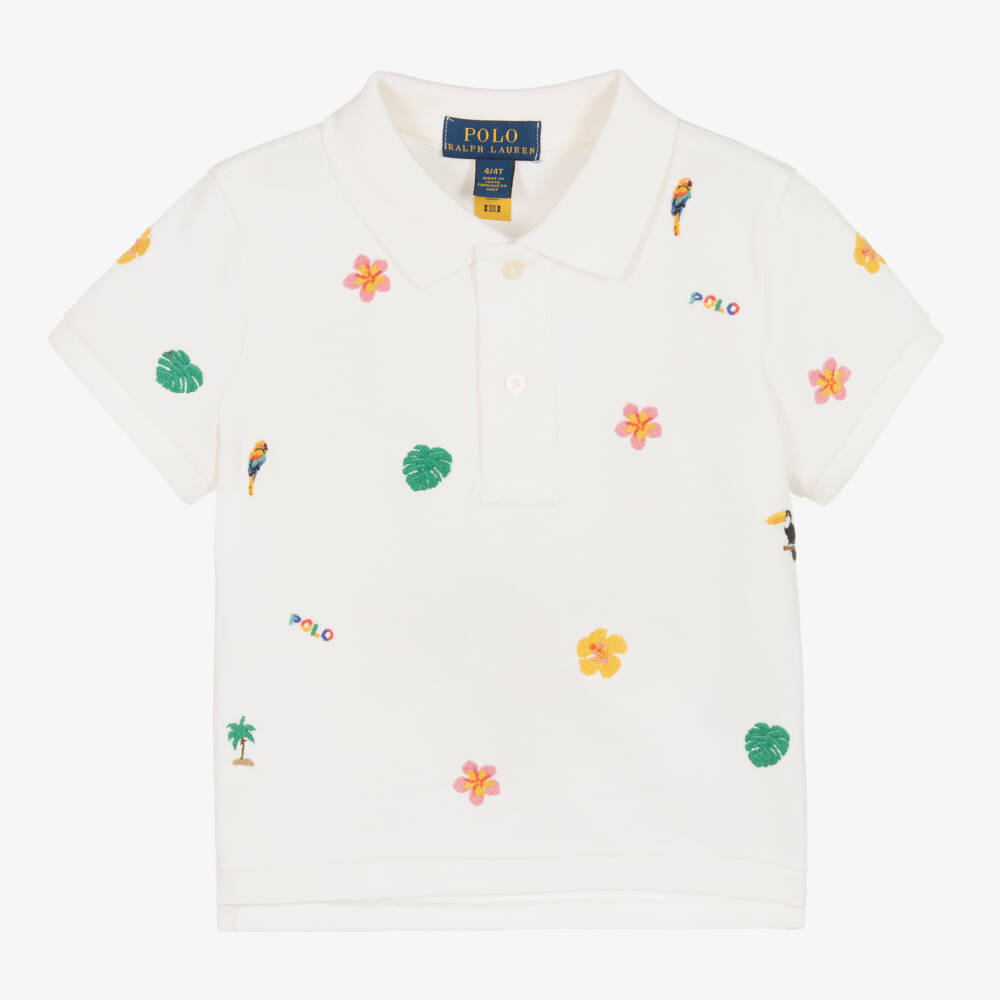 White polo shirt for girls by American brand Ralph Lauren, patterned with colourful, holiday-inspired embroidery such as parrots, flowers and palm trees, with the Polo logo. Made in comfortable cotton piqué, the hemline is slightly longer around the back and has vents on the sides to allow extra movement.