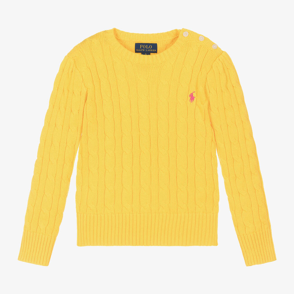 A lovely bright yellow sweater for girls by Ralph Lauren, knitted in the softest cotton. It has a cable knit pattern with a signature pink pony logo embroidered on the front. Easy to wear, pearlescent buttons fasten neatly on one shoulder.