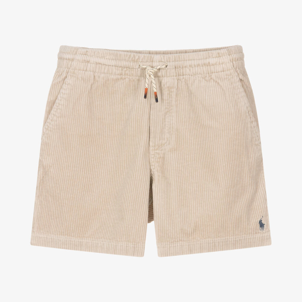 From Ralph Lauren, a pair of light beige corduroy shorts for teen boys, with the brand's signature pony logo embroidered on the front in navy blue thread. Four useful pockets and a drawstring on the elasticated waist complete the comfortable, laid-back design.
