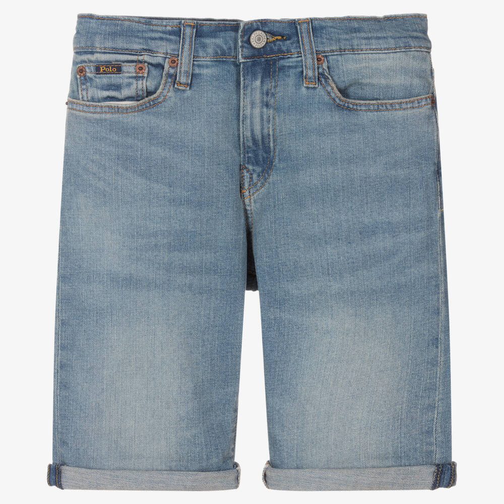 Mid-blue slim-fit denim shorts for teen boys by Polo Ralph Lauren, made in soft cotton with stretch for comfort. In a classic five-pocket styling, they have a brown faux suede logo tab on the back of the waistband and fasten with a zip and button.