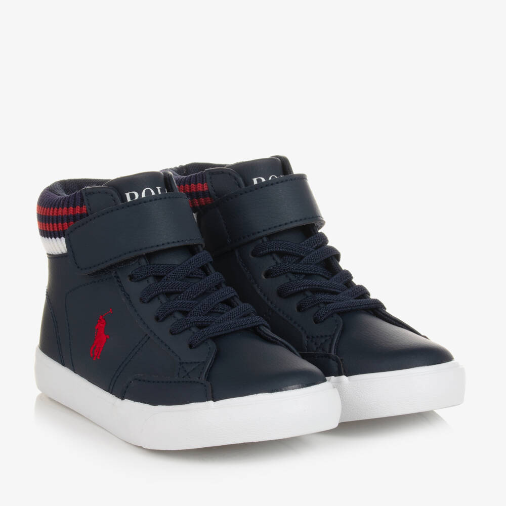 Teen boys navy blue high top trainers by Polo Ralph Lauren. Made in soft faux leather, these designer trainers have a bold white logo print on the tongue and a red pony logo embroidered on the side. These refined details coordinate with the knitted, striped ribbing around the ankles. Easy to slip on, they have elasticated laces and a velcro strap to adjust and secure. They are lined in soft mesh with padded insoles for extra cushioning. The non-slip rubber soles ensure a good grip.