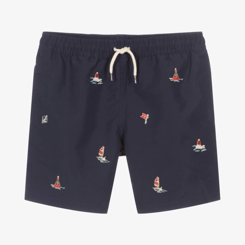Cool with a nautical influence, these navy blue swim shorts for teen boys are by Ralph Lauren. They are embroidered with eye-catching maritime symbols, including buoys, flags, anchors and sailing boats. Made from a smooth recycled fabric, these shorts have a breathable mesh lining, and fit comfortably with a drawstring waist. There are concealed side seam pockets, with a useful button-up pocket on the back for storing water-safe essentials.