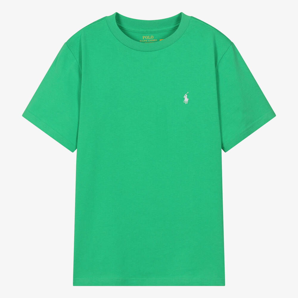 Teen boys Mini-me T-shirt by American brand Ralph Lauren, designed in green with an unmissable white Polo logo on the back. As seen in the adult collection, this designer tee is made in soft cotton jersey with a ribbed neckline and short sleeves. The signature pony logo is embroidered on the chest for further brand identity.