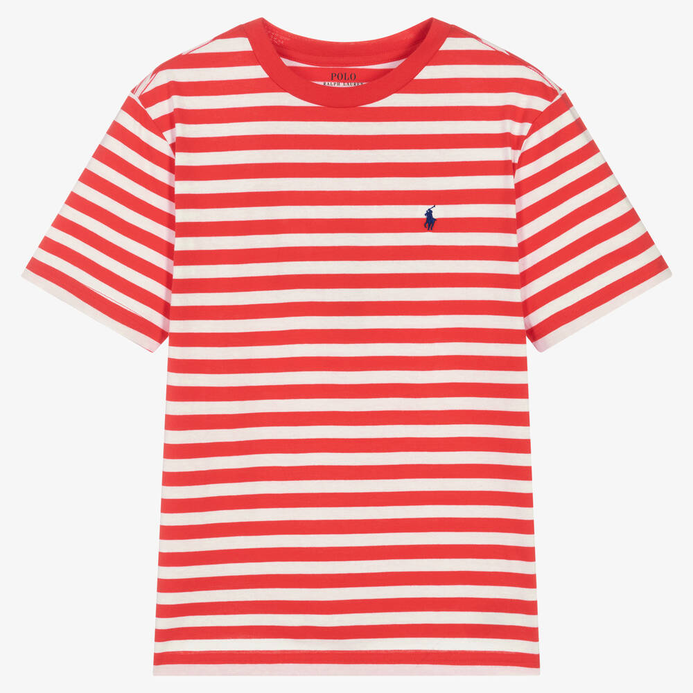 Red and white striped T-shirt for teen boys by Ralph Lauren, with the brand's sognature pony logo embroidered on the front in navy blue. Easy to wear, it is made in comfortable cotton jersey, with a classic ribbed crew neck.