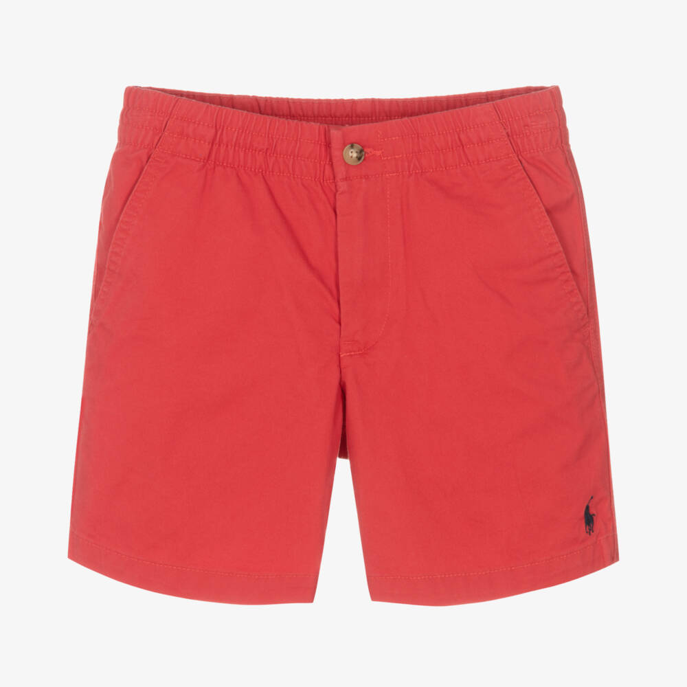 From Polo Ralph Lauren, coral red shorts for teen boys with the brand's signature pony logo embroidered in navy blue thread on the front. These casual shorts fasten with a zip and button on the front and have an internal drawstring for a better fit. Made in soft cotton twill with light stretch for comfort, the material has wrinkle and abrasion-resistant qualities for durable wear.