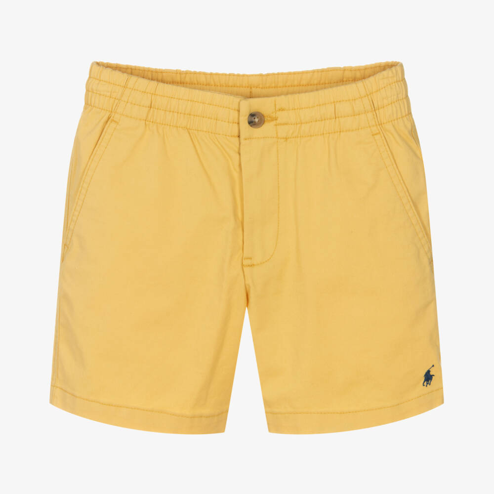 From Polo Ralph Lauren, yellow shorts for teen boys with the brand's signature pony logo embroidered in navy blue thread on the front. These casual shorts fasten with a zip and button on the front and have an internal drawstring for a better fit. Made in soft cotton twill with light stretch for comfort, the material has wrinkle and abrasion-resistant qualities for durable wear.