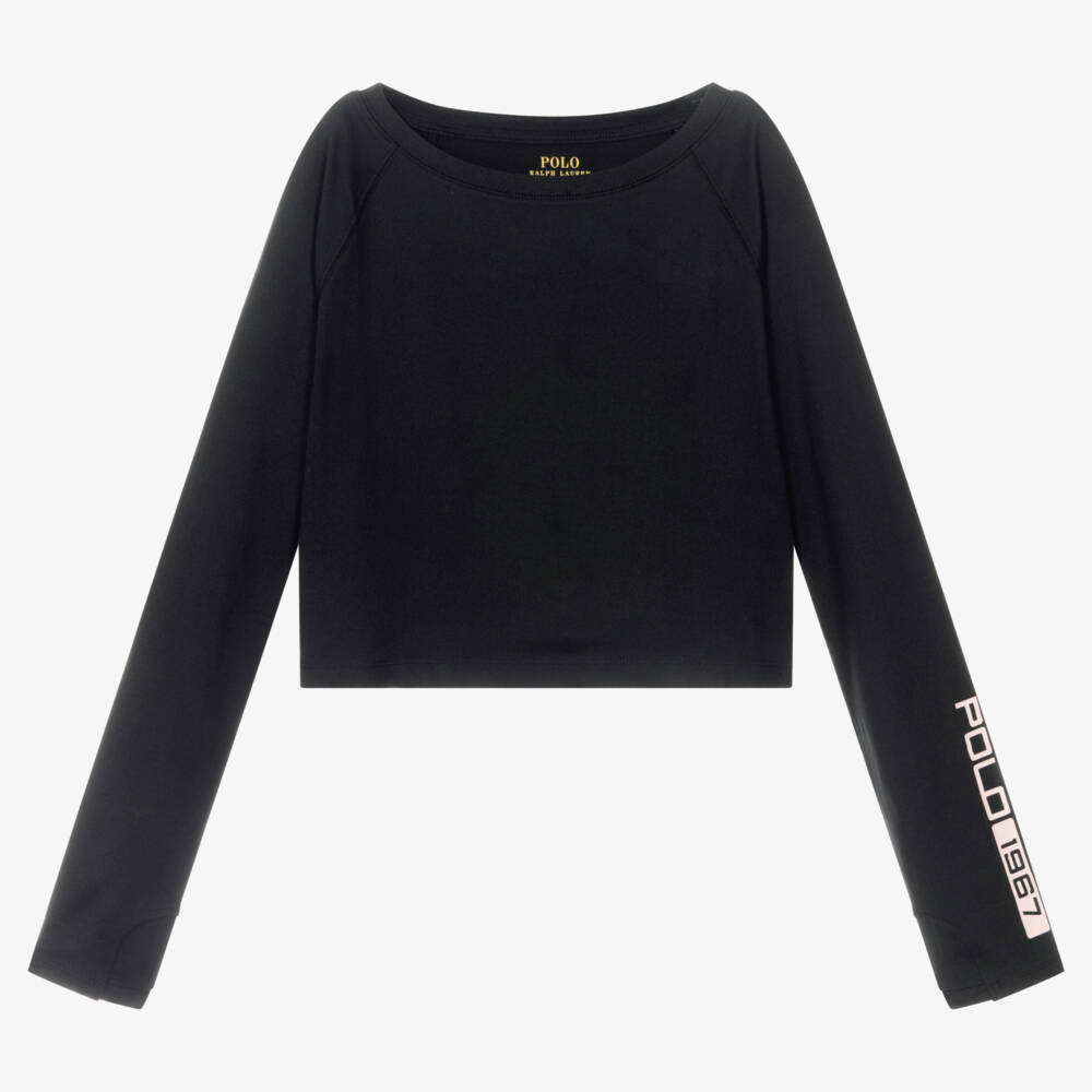 Teen girls black sports top by Polo Ralph Lauren, from the performance range. Look stylish during sport in this cropped scoop neck top, printed with a pink 1967 logo on one sleeve. Made with recycled materials, it has thumb holes for a useful addition to this base layer look.