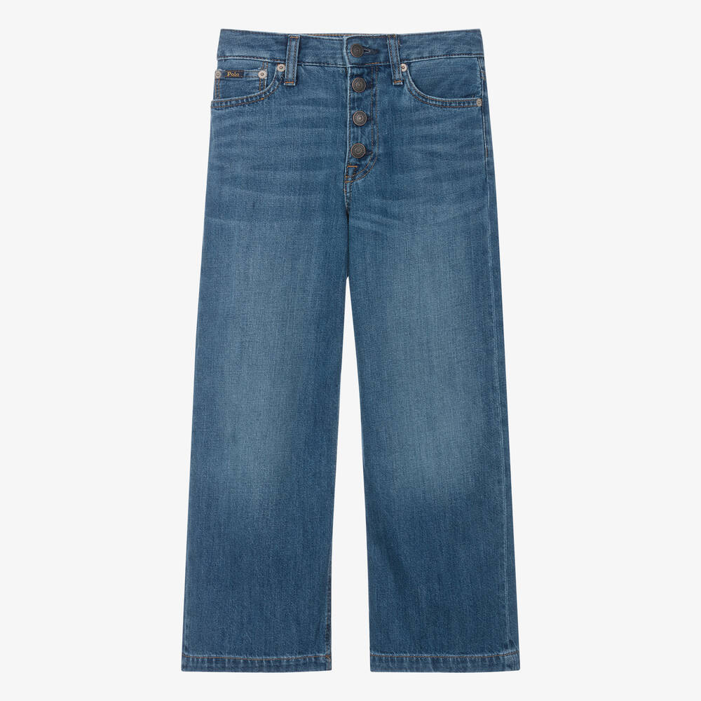 Effortlessly cool, these mid-blue wash cotton denim jeans for teen girls are by Ralph Lauren. With a stylish wide leg cropped silhouette, they have a Polo logo tab stitched on the front and a golden brown signature pony logo embroidered on the back, for a subtle branded touch. Easy to style, they fasten with buttons and have the classic five-pocket detailing.