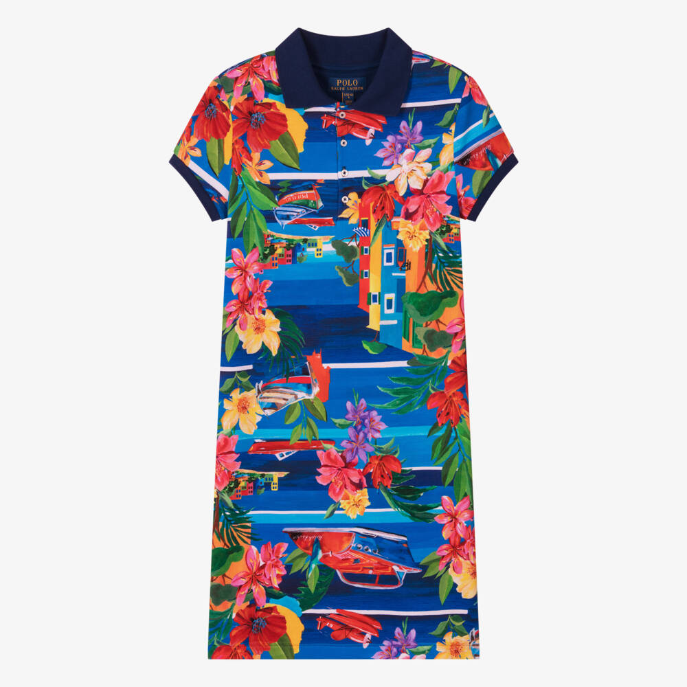 A striking blue polo dress for teen girls from American brand, Ralph Lauren. Ideal for adding a vibrant holiday vibe to her casual wardrobe, it has a colourful Côte d'Azur print, with the signature pony logo embroidered on the chest in white. For a classic finish, it has a ribbed collar and cuffs, with branded button fastenings on the front.