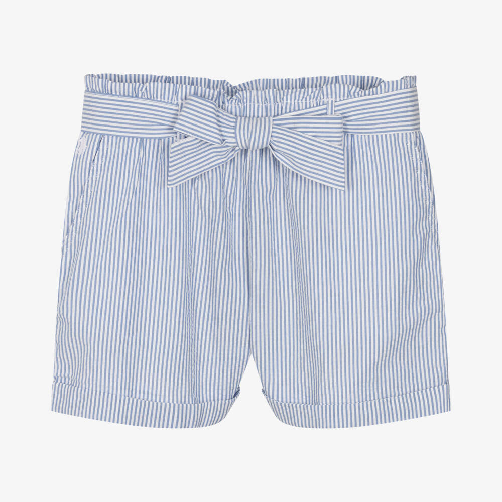 Blue and white striped shorts for teen girls by Ralph Lauren, with a signature pony logo embroidered in white on one hip. For an easy casual style, they have an elasticated waist, turn-up cuffs and slanted pockets on the hips. They are cut from lightweight cotton seersucker and come with a detachable fabric tie that can be tied into a bow on the front.