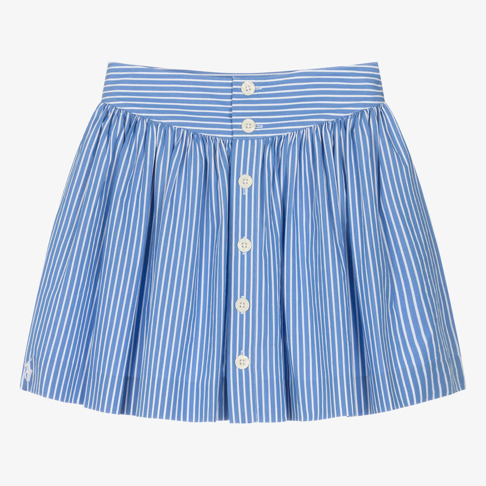 From American brand Ralph Lauren, a blue and white striped skirt for teen girls. This casual style is made in lightweight cotton poplin, with gathers for a feminine silhouette and a deep, shaped waistband. It fastens with buttons on the front.