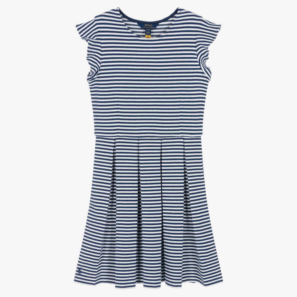 Navy blue and white striped dress for teen girls by Ralph Lauren, with the brand's signature pony logo embroidered in navy blue by the hem. Made in soft and stretchy, mid-weight ribbed cotton jersey, this casual design has flutter sleeves and a pleated skirt for a comfortable, feminine silhouette.