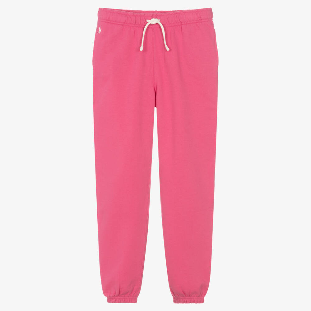 From Polo Ralph Lauren, pink joggers for teen girls with the brand's signature pony logo embroidered in white on the front. Classically styled with cuffed ankles and an elasticated waist which can be adjusted via drawstring for a better fit, these joggers made in soft mid-weight cotton-blend jersey with a fleecy inside are cool and comfortable. These joggers contain recycled fibres for a positive eco-impact.