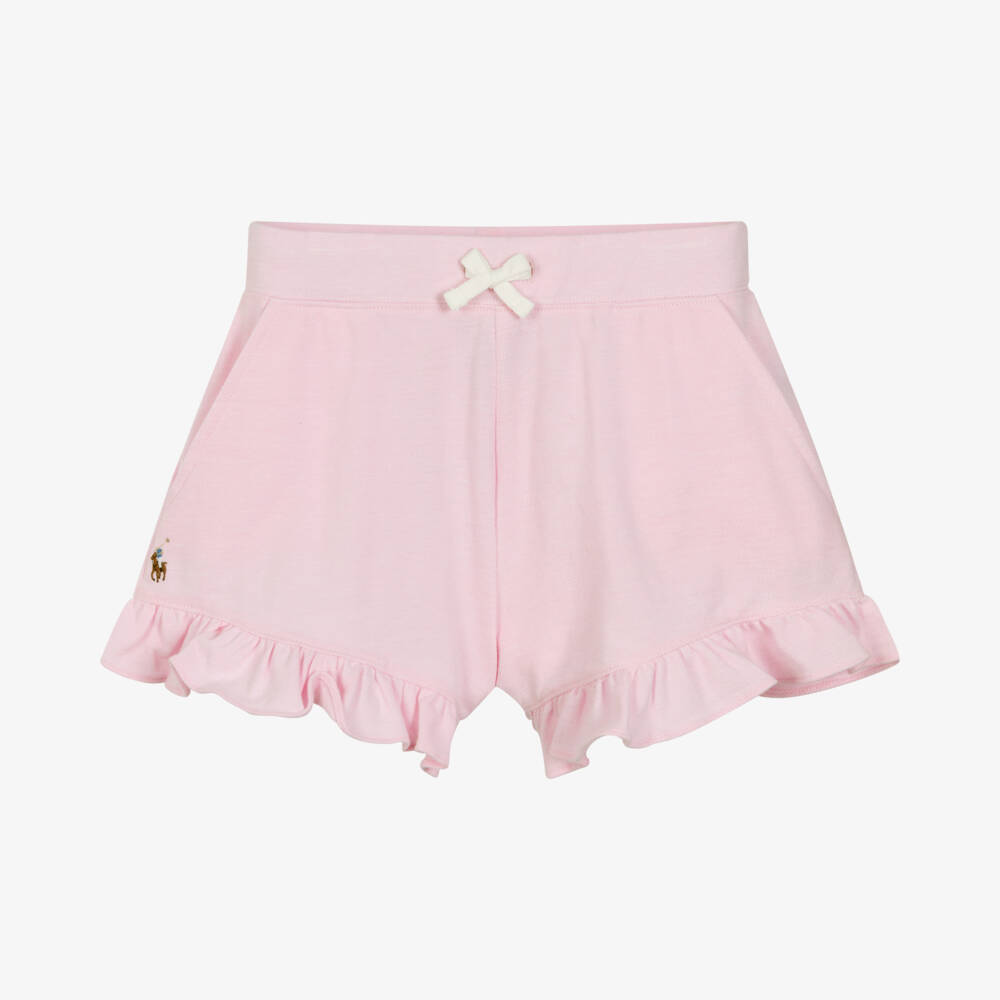 Pale pink shorts for teen girls by Ralph Lauren, with a colourful signature pony logo embroidered on one leg. Made in soft and stretchy cotton piqué for comfort, they have a drawstring waistband for a good fit, useful slanted front pockets and pretty frills around the cuffs.