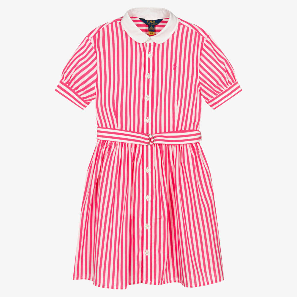 From Polo Ralph Lauren, pink and white striped shirt dress for teen girls with the brand's signature pony logo embroidered on the chest. It comes with a detachable belt which fastens around the waist for a feminine cinched silhouette and has a cute white collar for a preppy-inspired look. Made in soft cotton poplin, it is comfortable and lightweight ideal for warmer days.