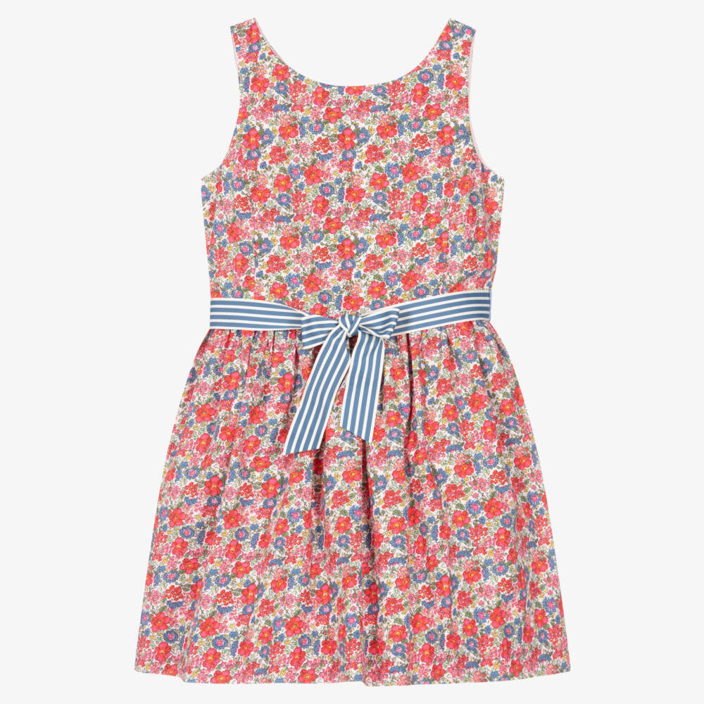 From Ralph Lauren, beautiful red and blue floral dress for teen girls with 'Polo' embroidered on the hem in pale blue for a discreet designer touch. It has a detachable blue and white striped ribbon sash belt which contrasts the pink hues of the floral and creates a cinched feminine silhouette. Made in lightweight cotton poplin, it has useful concealed pockets in the side seams and fastens with buttons on the back for a traditional look.